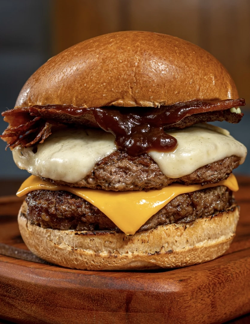 Pão selado na manteiga, 2 burger de 150g, 2fatias do nosso cheddar amanteigado, 2 fatias de mussarela da fazenda, bacon bem crocante e um barbecue extremamente delicioso.