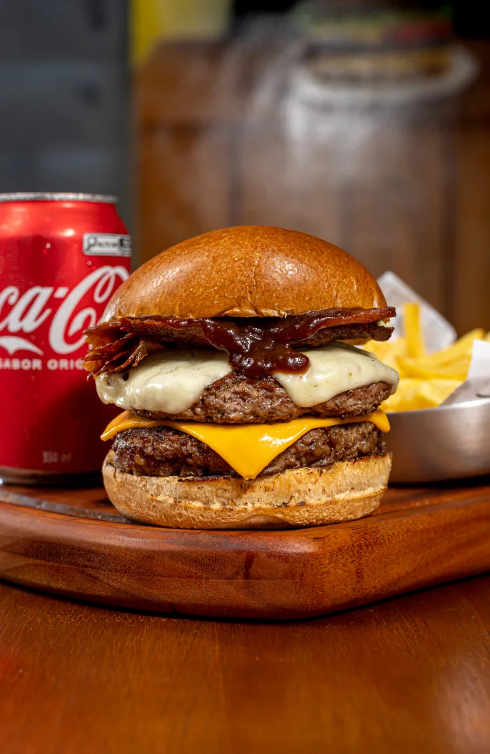 Pao selado na manteiga 2burgers de 150g, 2 fatia de mussarela, queijo cheddar amanteigado, bacon bem crocante e um barbecue extremamente delicioso! (Doble Uau + Coca-Cola lata + Batata frita)