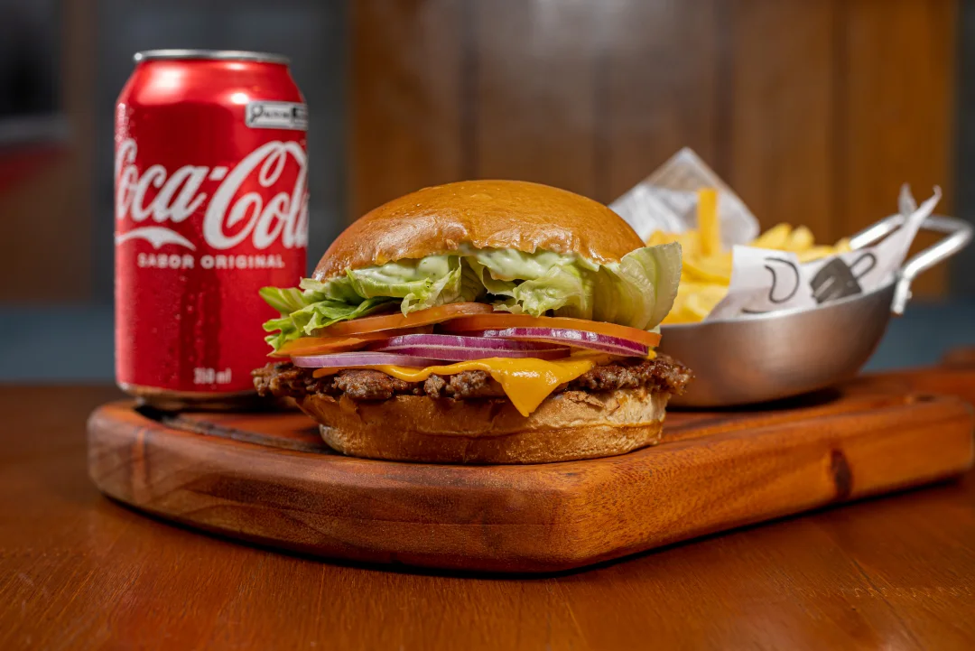 Pão tostadinho, Burger de 90g esmagado na chapa, queijo cheddar amanteigado, e um delicioso barbecue Acompanha batata frita uau e refrigerante lata